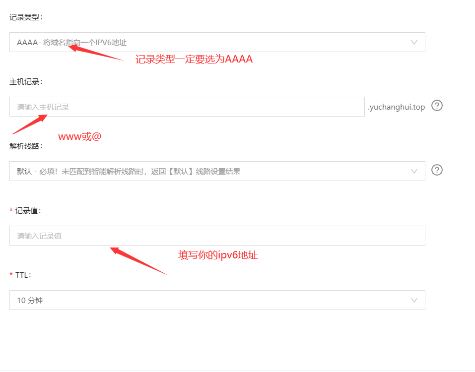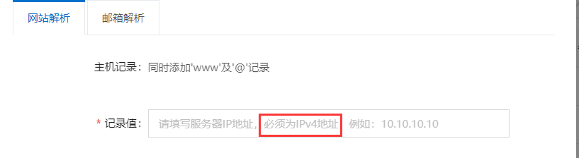 阿里云解析地址的新手引导只针对为ipv4地址,因此ipv6地址需要自己手动添加。