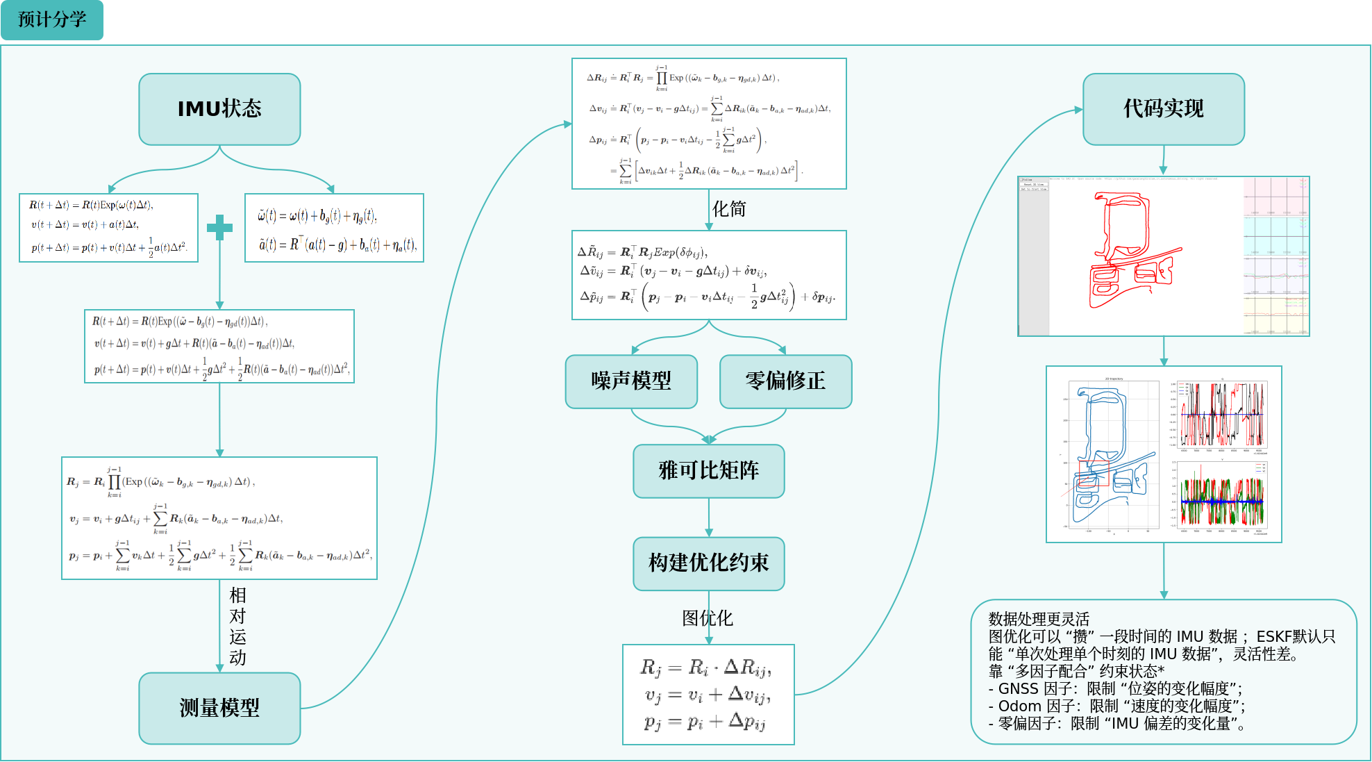 - 最终得到“误差如何随时间变化”的线性方程,方便用卡尔曼滤波估计误差,再修正名义状态。 类比:就像用“粗略地图(名义状态)+ 小范围偏差(误差状态)”导航,因为偏差小,所以“偏差的变化”可以用简单的线性规律计算,最后把偏差补到粗略地图上,就能得到精准位置。