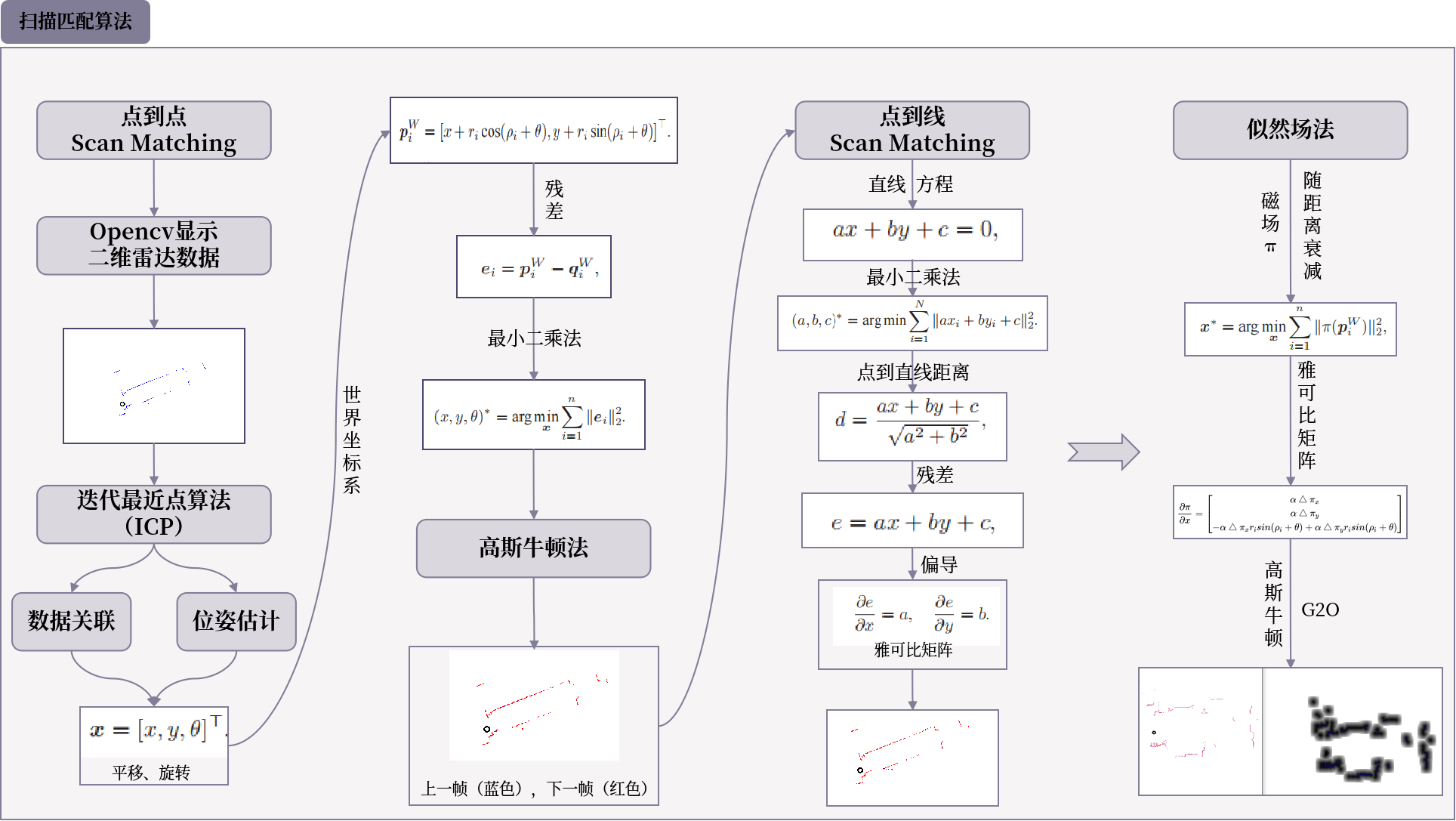 - 激光雷达负责通过点云匹配(如 ICP、NDT 等方法),算出 “位姿变化的最终结果”(机器人走了多远、转了多少角度)。