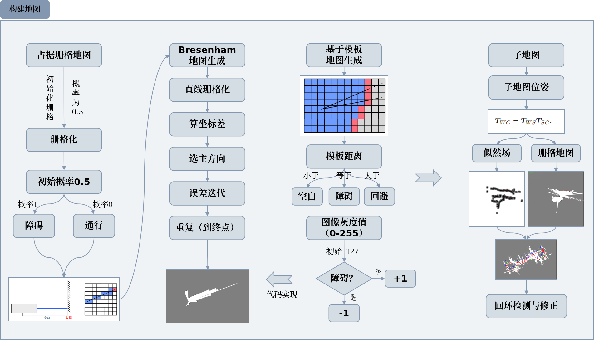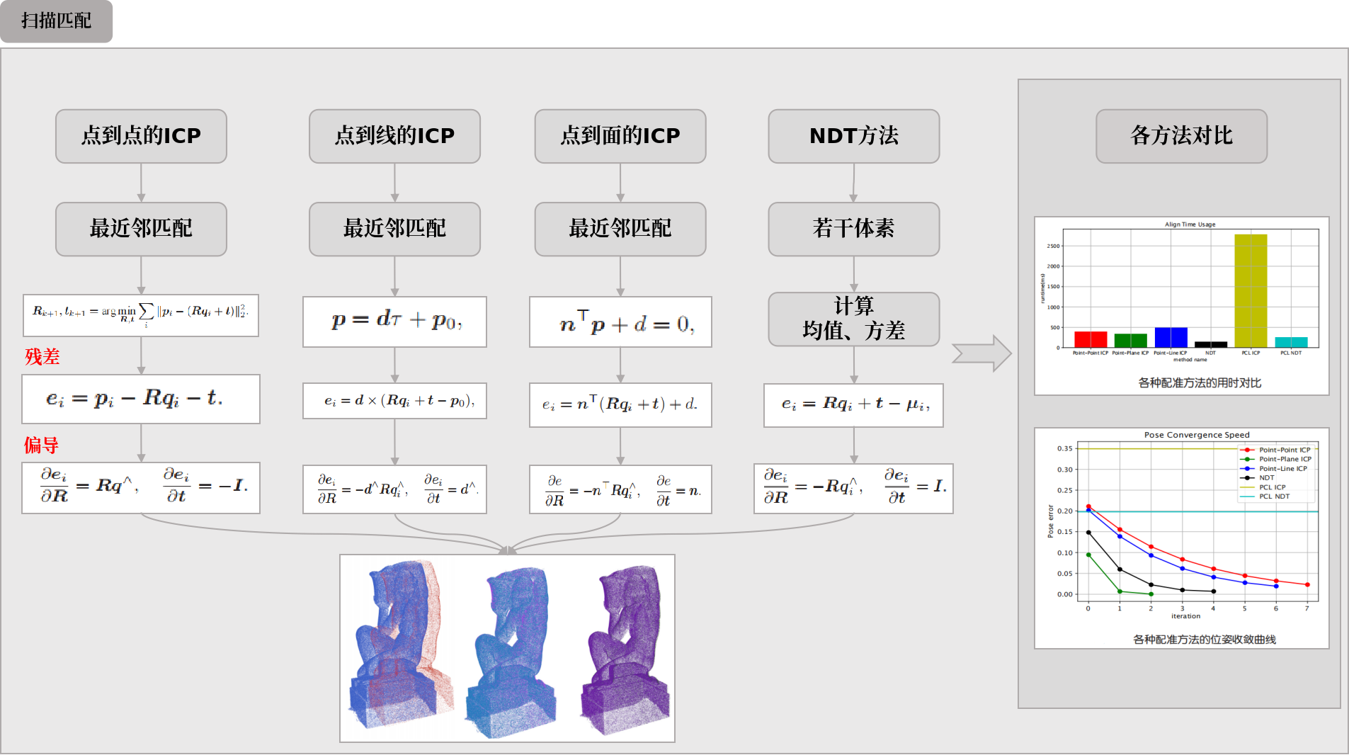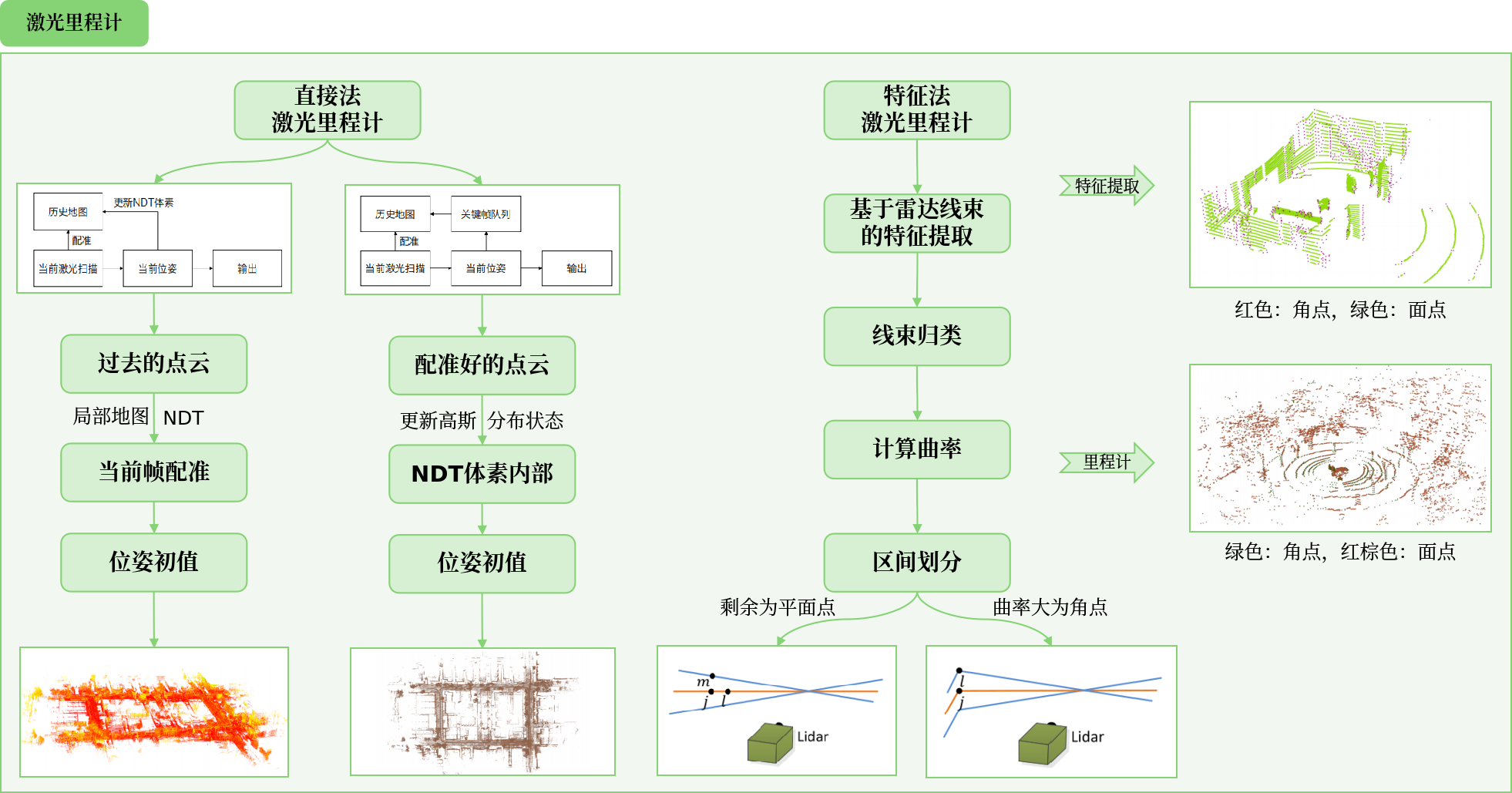 - 直接法激光里程计:要么 “当前激光扫描和上一次的扫描直接对齐”;要么在 3D 场景下,把最近一段时间的点云凑成一个 “小局部地图”,再让当前新扫描的点云和这个小地图对齐。这种方法不用特意找 “点云里的特殊特征(比如尖角、平面)”,直接拿整点点云来匹配,还能基于 ICP 或 NDT 实现(看左侧流程图)。